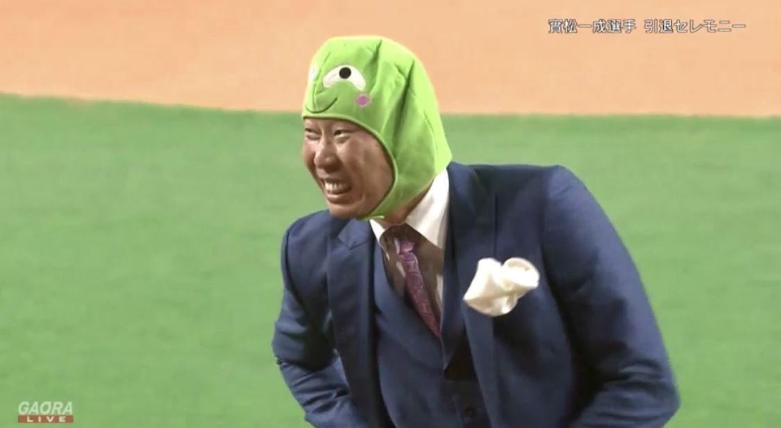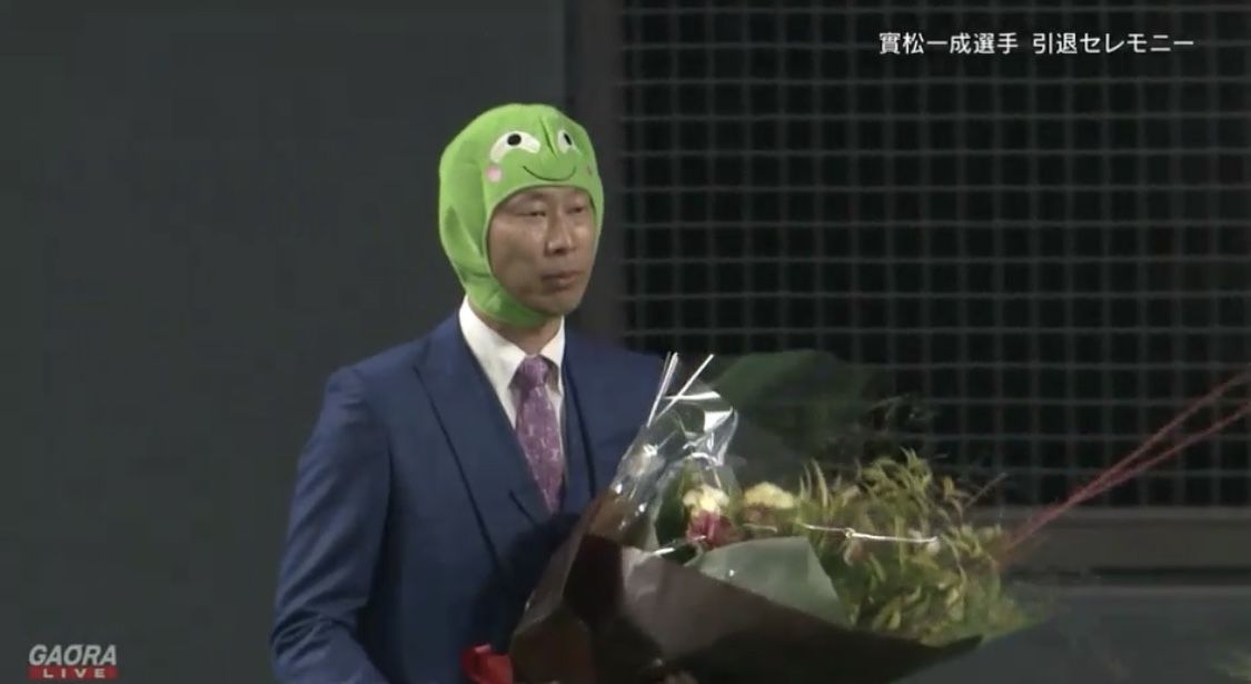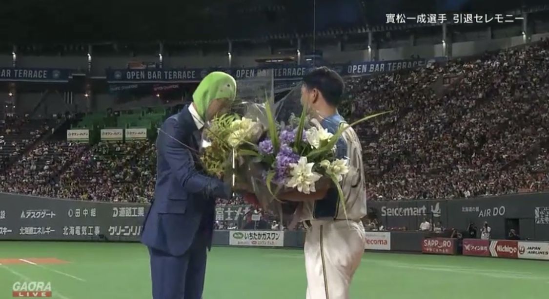 日本ハム史上初めて捕手として1位指名された実松のセレモニーには、同じ98年ドラフト同期入団の建山義紀氏(ドラフト2位)、森本稀哲氏(同4位)が花束を贈呈。森本氏が被り物姿で登場し、花束を渡した後は実松を持ち上げるなどやりたい放題で、実松のしんみりムードを吹き飛ばした。