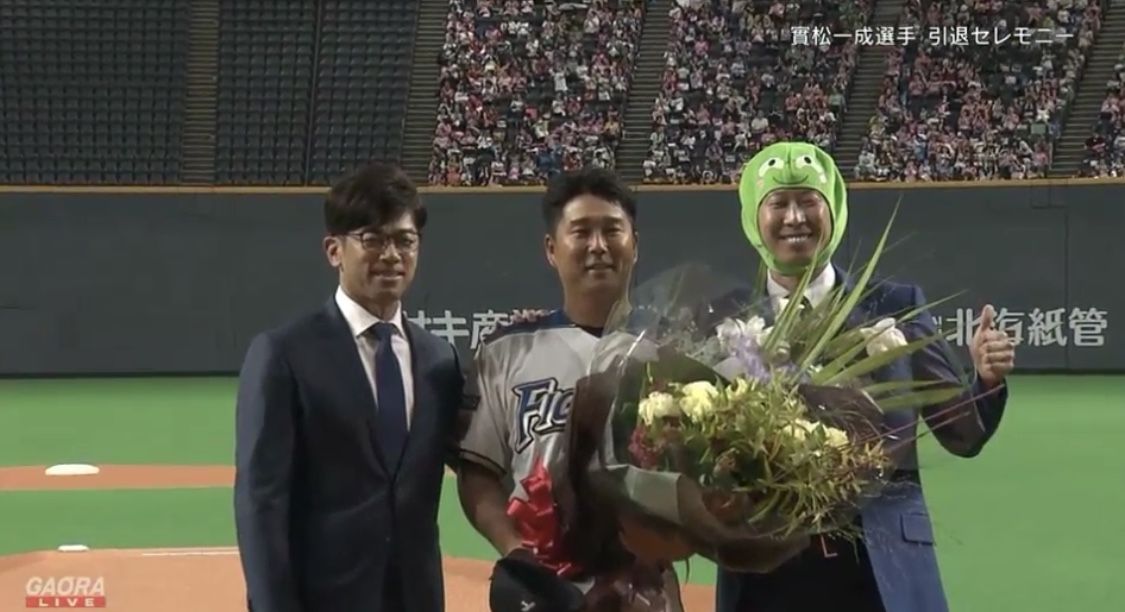 日本ハムの実松一成2軍育成コーチ兼捕手(38)が26日、札幌市内の球団事務所で引退会見を行い、同日のオリックス戦前には引退セレモニーも行われた。