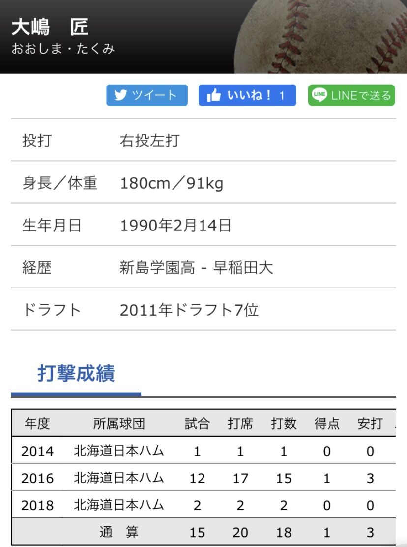 大嶋は通算で1軍に15試合出場してヒット3本