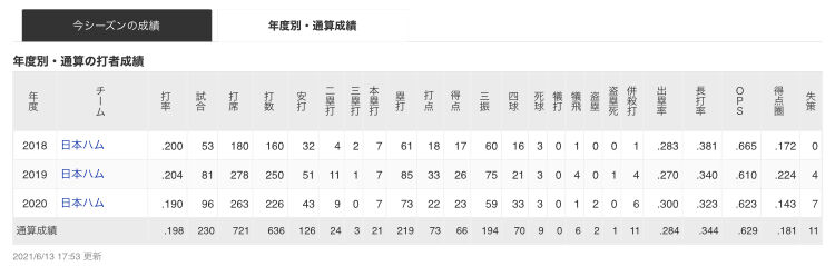 出塁率.284 長打率.344 OPS.628