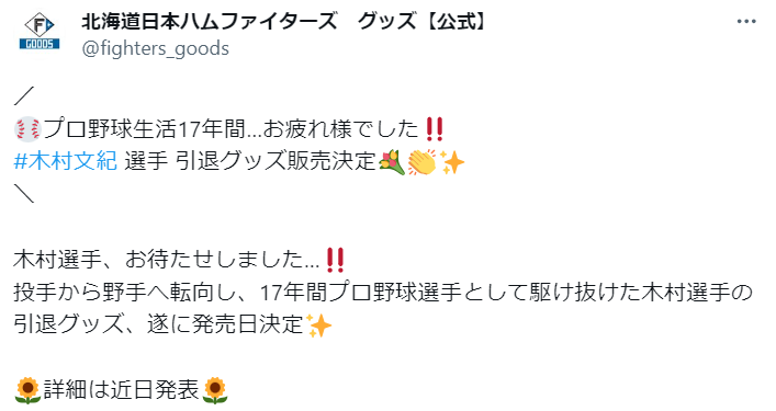 ⚾プロ野球生活17年間…お疲れ様でした‼#木村文紀 選手 引退グッズ販売決定💐👏✨