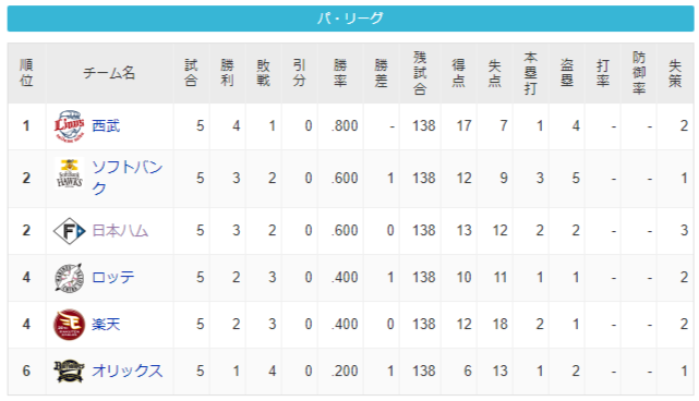 パーソル パ・リーグ 順位表 (4/3)⚾️