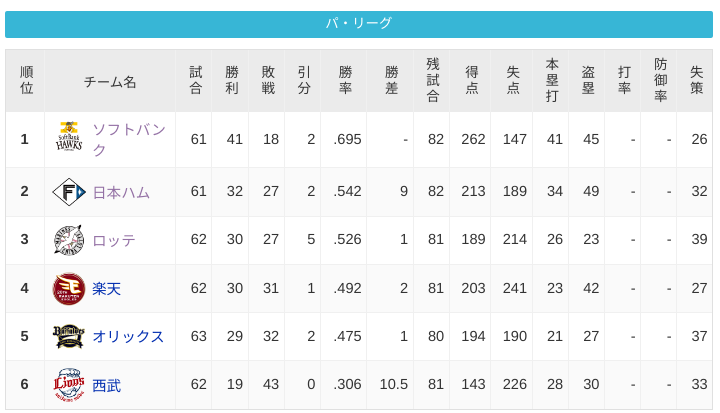 パーソル パ・リーグ 順位表 (6/15)⚾️