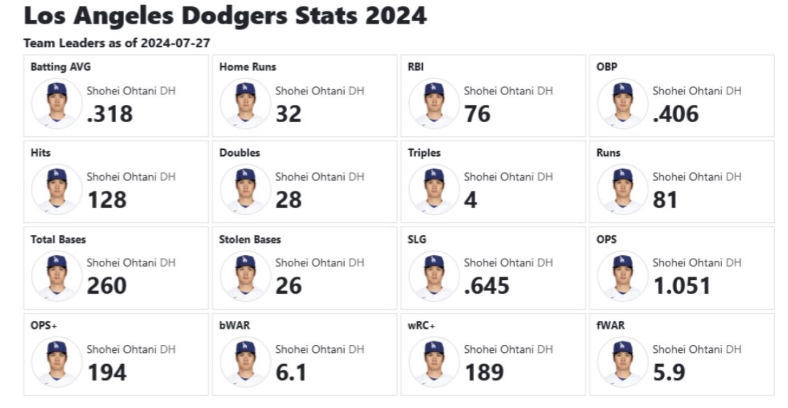 打率、安打、二塁打、三塁打、本塁打、打点、盗塁、塁打、出塁率、長打率、OPS、OPS+、wRC+、rWAR、fWAR全部もれなく大谷がチーム内一位の模様