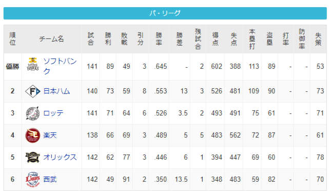 パーソル パ・リーグ 順位表 (10/1)⚾️