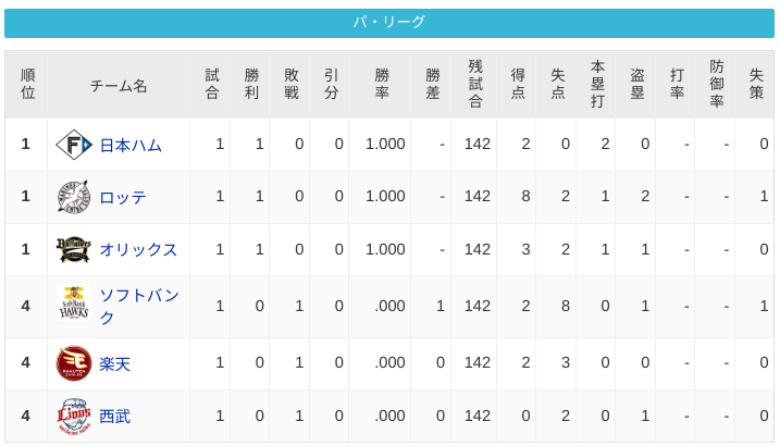 パーソル パ・リーグ 順位表 (3/28)⚾️