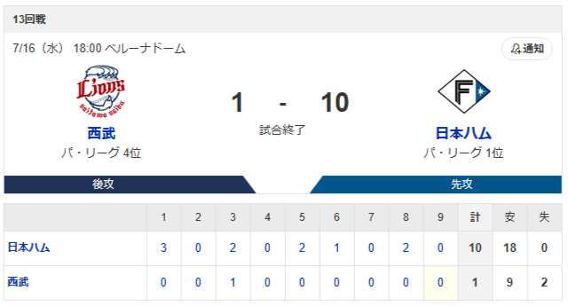 それでハムに4勝9敗なの愚かすぎるだろ