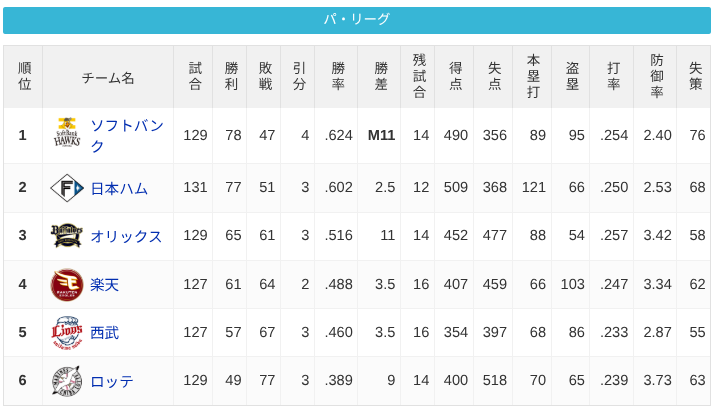パーソル パ・リーグ 順位表 (9/16)