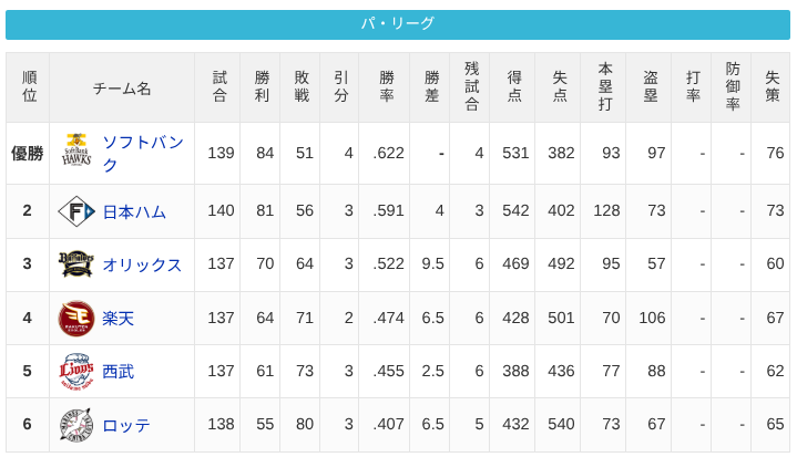 楽天と西武が入れ替わる可能性はありそう。どっちもまだ試合結構残ってるし