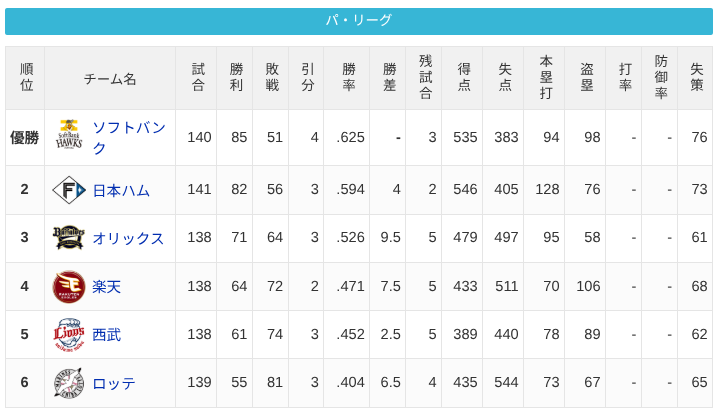 パーソル パ・リーグ 順位表 (9/28)