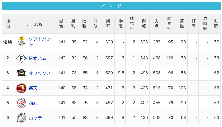 パーソル パ・リーグ 順位表 (10/2)