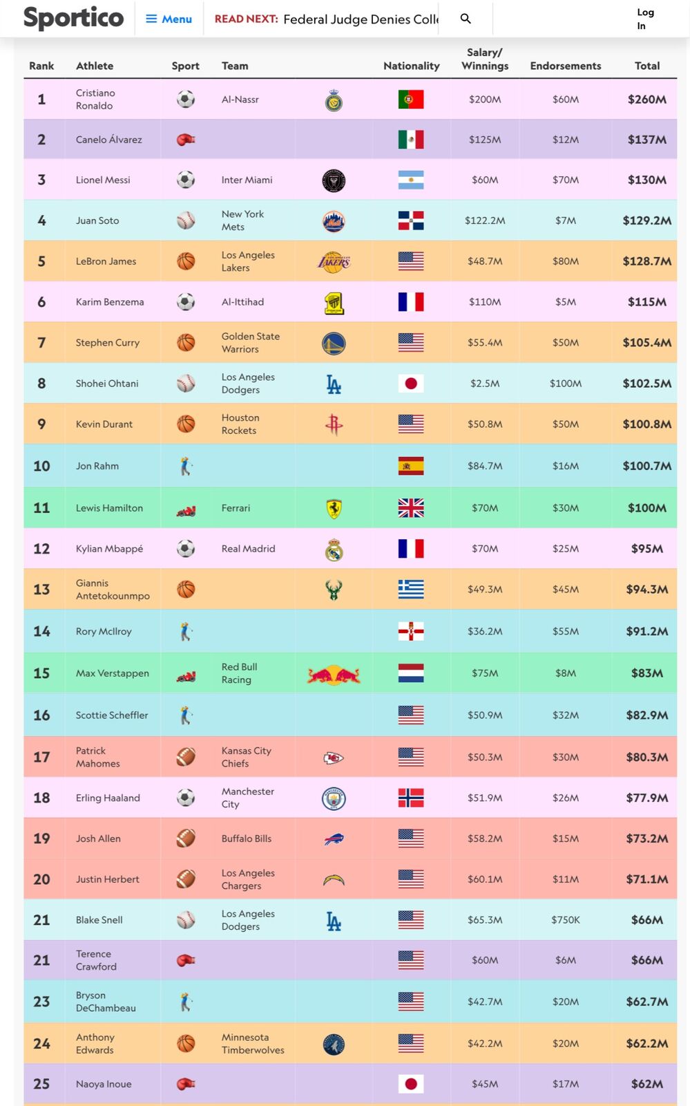 大谷が出て来る前は日本人スポーツ選手がスポンサー収入で世界一になるとか考えもしなかったな