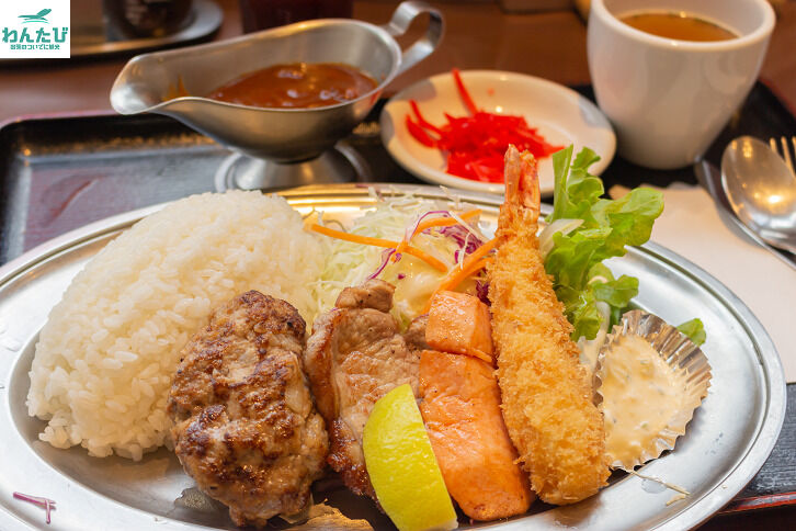 欲張りだな、カレーにハンバーグと豚カツのせるタイプ?