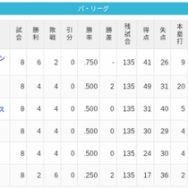 【4/8】パ・リーグ順位表|混パの予感…日ハムの現在順位がこちら