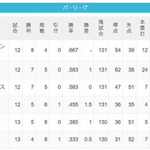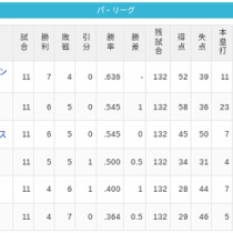 【4/11】パ・リーグ順位表|逆転負け…日ハムの現在順位がこちら