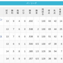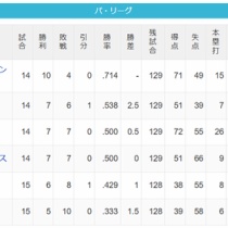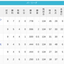 【4/9】パ・リーグ順位表|カード勝ち越し…日ハムの現在順位がこちら