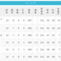 【4/3】パ・リーグ順位表|打線爆発12得点大勝…日ハムの現在順位がこちら